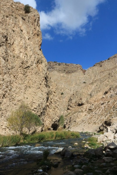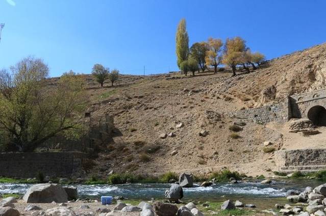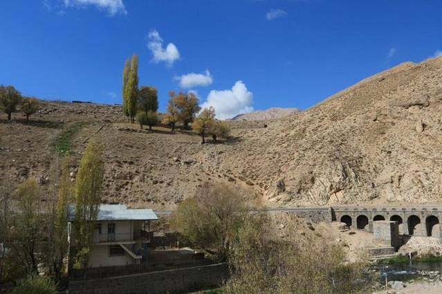走到小溪边,阳光照射下,溪水和对面的彩林都闪着金光,这是一个秋日里的童话。走到桥底,抬头,蓝天下的峡谷显得特别明丽好看。悠闲地在峡谷里欣赏着醉人美景,很惊喜地发现ALI又在河边忙活着什么,这真的是个太热情太有意思的老人!果然,ALI洗好了杯子,又神秘兮兮地在车尾箱拿出一个水壶:“来一杯吧,我自己酿的葡萄酒”。要知道,伊朗可是一个禁酒的国家,喝酒只能这样偷偷地进行。cheers!在伊朗的深山里,面对着这样的灿烂秋色,品尝一杯自酿的葡萄美酒,实乃人生一大乐事!这种感觉太棒太难忘了!