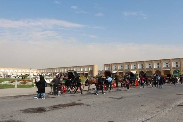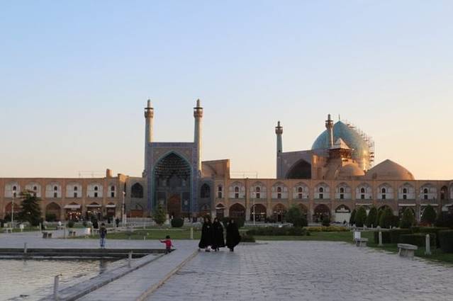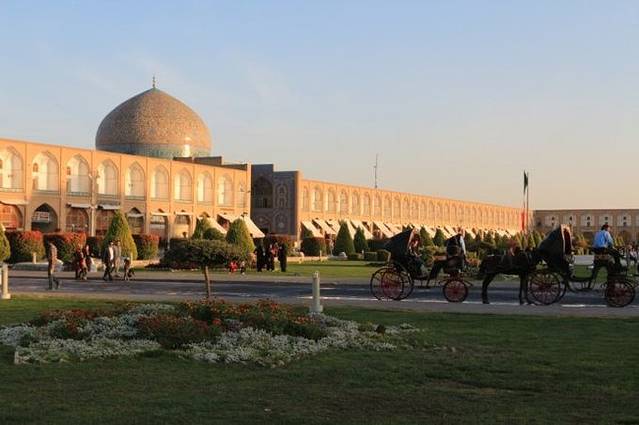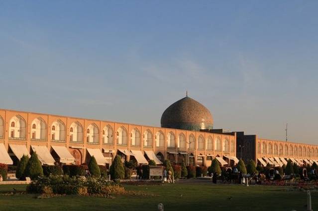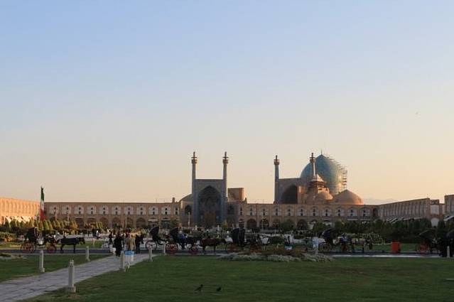 下午四点半,在日落前半小时抵达了这个世界第二大广场,也被列入世遗的——伊玛目广场。它落成于1602年,500米长,160米宽,仅次于天安门广场,是莫斯科红场的两倍。当年,阿巴斯大帝就是在这里检阅军队和观看马球。广场南侧正面是伊玛目清真寺(也叫皇家清真寺),东边的中心是sheikh lotfollah清真寺,西边正中是ali qapu宫。