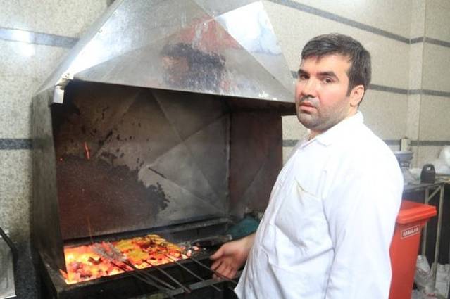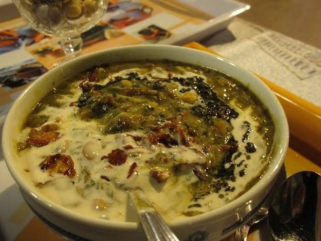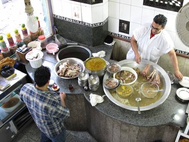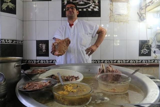 离开古列斯坦宫的时候下了一点小雨,很快停了。我们进了对面的大巴扎,里面很大,日常用品应有尽有,甚至还有隐藏于大巴扎中的清真寺,生活气氛浓厚,可就是没有找到地毯。这时候已经中午12点了,飞行员发了信息说在古列斯坦宫门口等,一起去吃饭。于是我们穿出了巴扎走回古列斯坦宫门口,路上经过一家羊肉店的时候,实在忍不住进去吃了一盘羊头,在这里才知道原来那些羊汤是用来沾大饼的,我们之前还捧起来喝得津津有味,真是闹笑话了。 看我们举起相机,大厨非常配合地拿起羊头摆了个POSE,似乎对自己的出品非常自信,非常自豪。望着这一大锅飘着浓香的羊头汤,还真是很诱人呢。