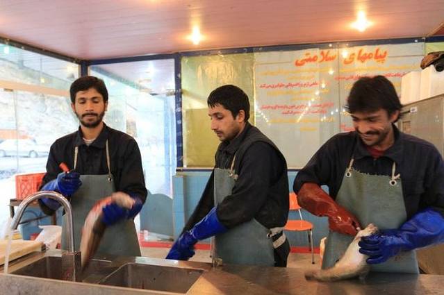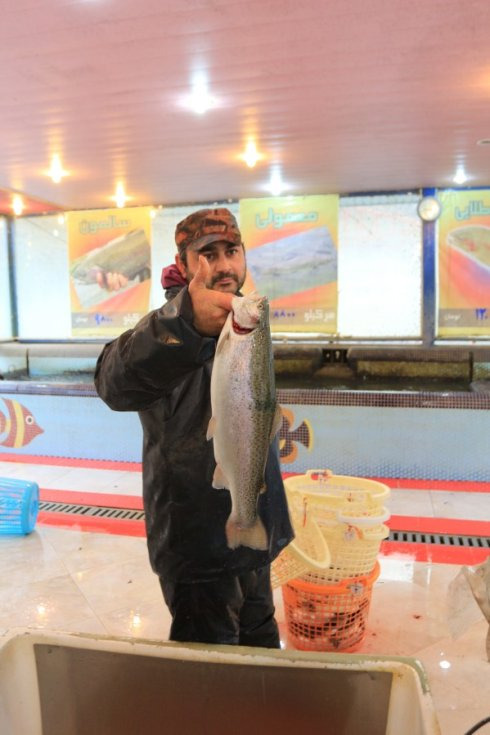 这里一条三文鱼才大概人民币20多元,超便宜啊!不知他们会不会起鱼生呢?不知伊朗有没有wasabi呢?我的吃货反应又开始发作,可惜时间不够,只有想的份。不管劏鱼还是抓鱼的伊朗帅哥都非常热情,一直露出灿烂的笑脸,见我们镜头对准他,还非常配合地摆出姿势,总的感觉,伊朗人是非常平和,快乐的,并不如外界想象的那样压抑。