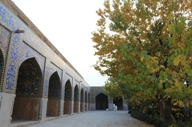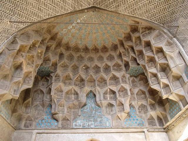 清真寺的正门外形是典型的伊朗式壁龛结构,面向正北,使整个广场形成了完美的对称。蜂窝状的拱顶显得非常壮观,每个立面都由有着错综复杂精美图案的釉砖镶嵌而成,让人叹为观止。而墙壁上的壁画和装潢,则反映着当时文化艺术的最高水准。