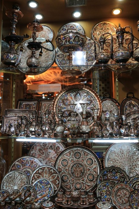 波斯最出名的特产就是地毯,我们也想带一副回家,于是继续在这里逛了一圈,店主们都非常热情,一张一张地打开给我们看,最后没有成交他们也不会给脸色看,依然是笑脸相迎,还客气地欢迎我们下次再来。看了许多家,实在是花多眼乱,在伊朗买地毯对有选择恐惧症的人来说真是个难题,而且我们看得上眼的基本都要五千人民币以上,还是有点贵。不过即使不买,在这里逛逛也是非常值得的,那些精美的地毯真是让人大开眼界,印象最深的是一副表现麦加朝圣盛况的地毯,售价十多万人民币,栩栩如生,真的是可以让人感受到宗教神秘的力量。若是谁家的豪宅挂上这样一副整面墙大的波斯地毯,那绝对是秒杀一切奢侈品的文化提升之作,而且绝对可以让一颗浮躁的心沉淀下来……在店铺外,我们都看呆了。可惜,这幅作品不允许拍照。