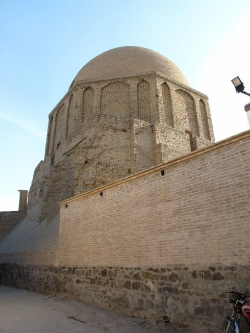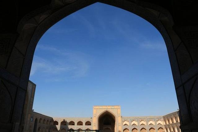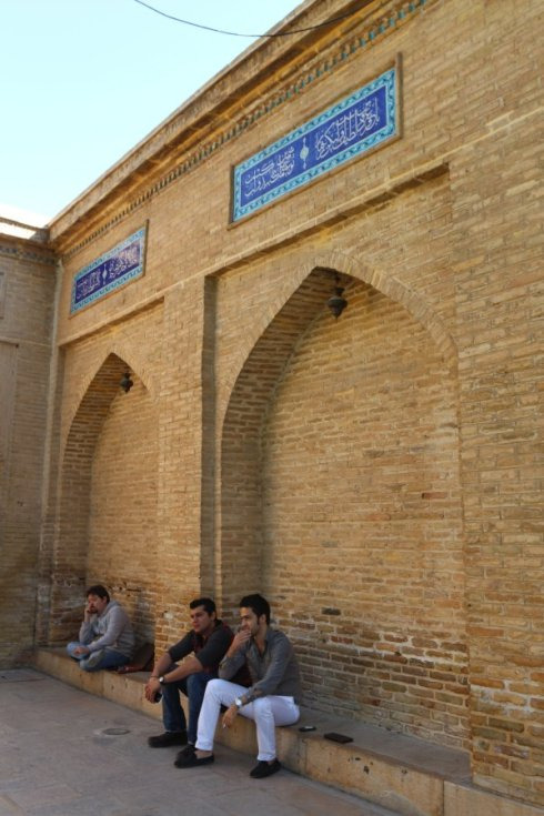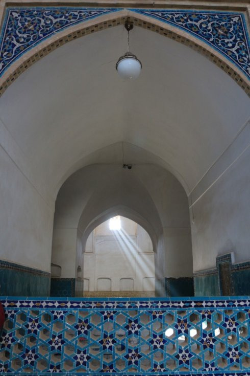 穿过其中一个清真寺,豁然开朗,一个大广场呈现眼前,从这里可以看到整个星期五清真寺是一个典型的“四合院”式的结构,东西南北四个门两两相对,呈十字形对称,庭院中央,还有一个水池,典型的波斯风格。我们都非常喜欢星期五清真寺的广场,很大,而且没有其他游客,非常安静,可以让我们更好地体会这里虔诚的氛围。主寺大门的圆顶上还停留着许多鸽子,偶尔在广场上空飞翔穿梭,带来一些灵动的气氛。外面大巴扎的喧嚣,早已杳若沉鱼,置身于此,浑然忘我,也忘了尘世。