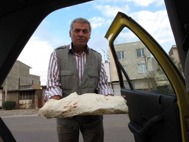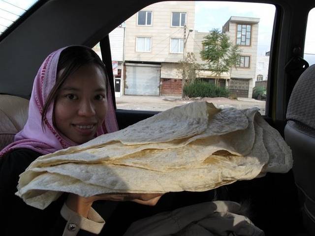 离开高速公路后,ALI让我们稍等一下,他去买点早餐。我们说我们也换好了钱,ALI忙说他请我们吃。等ALI捧着早餐回来,我们都好激动!好大的饼!太有中东的感觉了!ALI让我先拿着,他再去买些奶酪和果酱,我捧着这样巨型的早餐,开始犯愁,去哪找那么大的袋子来装呢?没多久,ALI买完果酱回来,顺手接过大饼,放到了副驾位置上,我和同伴哑然失笑,这是伊朗啊!