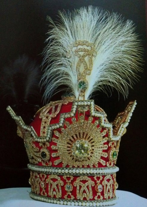 巴列维国王的皇冠。正中是一颗黄色的巨钻,另由3380颗钻石和368颗珍珠镶嵌而成,礼萨汗国王1926年加冕和巴列维国王1967年加冕时都曾使用过,价值连城。