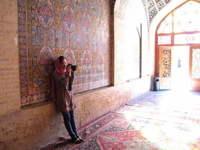 伊朗是世界上少数几个对外国女性也严格着装规定的国家,头巾,长度过臀部的长袖上衣,长裤或长裙是最基本的要求,来伊朗之前,不清楚这一要求的严格度,只是听说若不符合规定会有宗教警察过来找麻烦,何况今天还要过海关,还是谨慎一些为好,所以第一天入境伊朗我把自己穿成一身黑,黑衣,黑裤,还准备了黑头巾,当漂亮的空姐递给我一条紫红色的头巾,我还颇为惊讶,原来,头巾不一定要黑色的,它甚至可以是鲜艳的,也幸好有了这条头巾,拍出来的照片亮色许多。随着在伊朗一天天的行走和观察,我也越来越放松了心情,穿着衣服的颜色一天比一天浅。其实,伊朗人要的只是你对他们国家和文化的尊重,并没有太多让人压抑的宗教限制,至少在我行走的这些天,一个宗教警察也没有看到过。