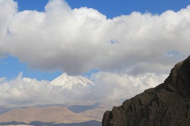 过了清真寺,达马万德雪山开始展露美丽的容颜,第一眼看到这座传说中的中东第一高峰,我们都非常兴奋!一阵猛拍!虽然此时的它依然在云层中若隐若现,但可以看到顶峰已经很满足!而且没有关系,我们今天的行程都是绕着它转,前面还有很多的机会一睹芳容。