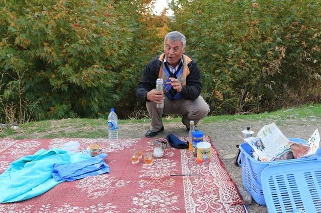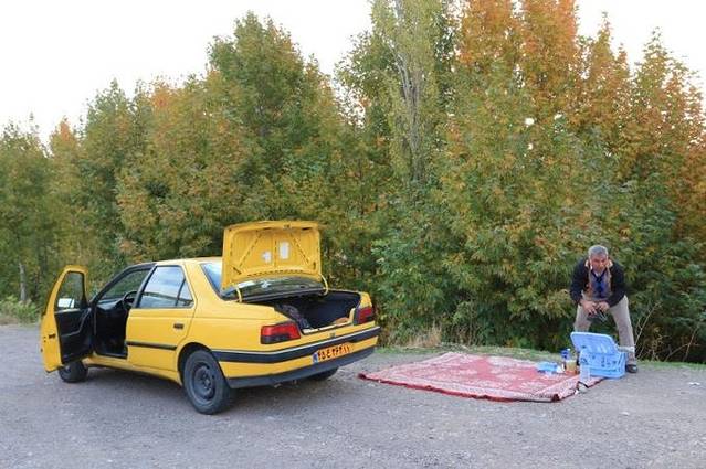 在路边的一片空旷地,秋色灿烂的地方,ALI把车停了下来,说我们就在这里野餐!只见他打开车尾箱,熟练地拿出一块毯子铺在地上,又拿出野餐盒,里面东西一应俱全:咖啡壶、奶粉、糖、伊朗红茶、蜂蜜、果酱、奶酪……甚至还有自酿的葡萄酒!wow~太棒了,还是现煮的咖啡呢!伊朗人真会享受生活!