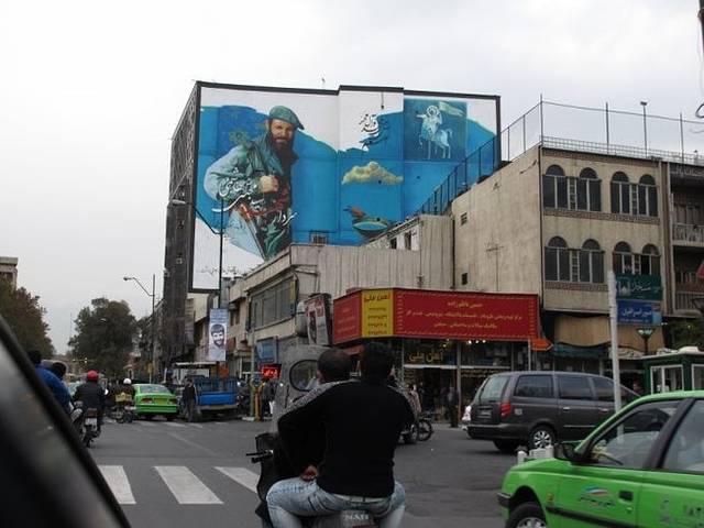 一直以为这面著名的“国旗”是在前美使馆附近,其实不是,颇有些距离,如果专程去找可能还不太好找呢,幸好ALI专程兜路带我们过来看,从立交桥上远远就望到这面占据了整个大楼侧面的旗帜,虽然早有心理准备,还是觉得很有意思,也实在佩服于伊朗人的创意。