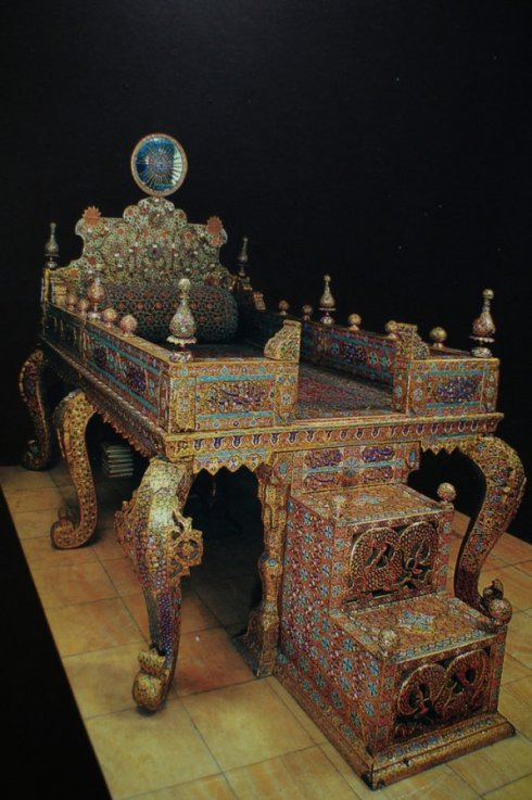 孔雀宝座。长期以来象征着伊朗王权,镶满了珠宝,奢华无比。巴列维国王加冕时正是使用此宝座,随着巴列维王朝被推翻,才被从古列斯坦宫转移到这里保存和展览。