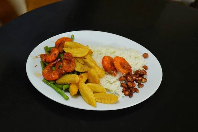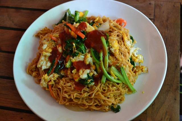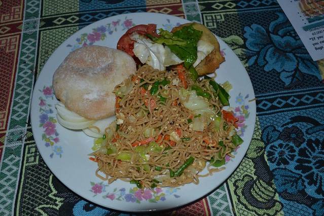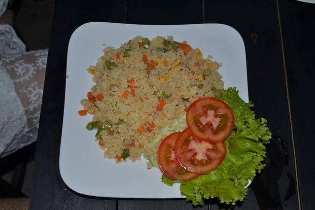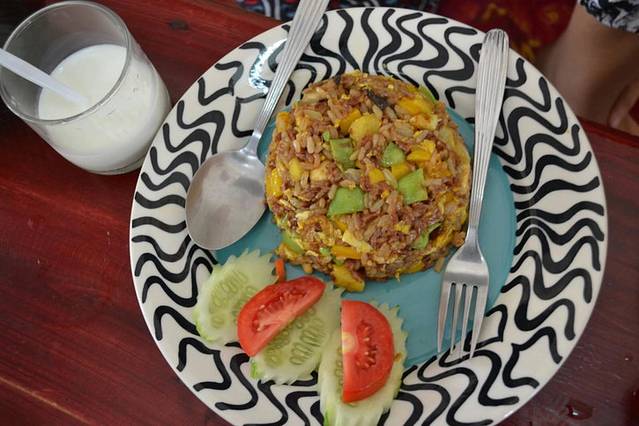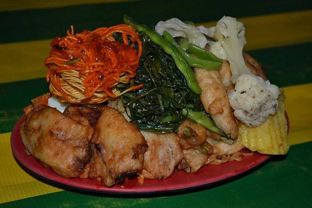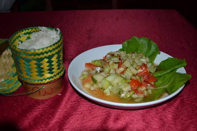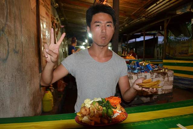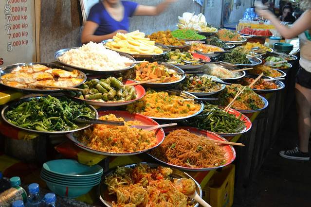 在琅布拉邦就可以对老挝的餐标稍微放轻松些了,一万基普一份的自助拼盘可以让你吃到爆表,这边有两点要注意,所有菜系全部是素食,而且只能盛取一次。所以吃多少的首要条件在于你盛多少!~