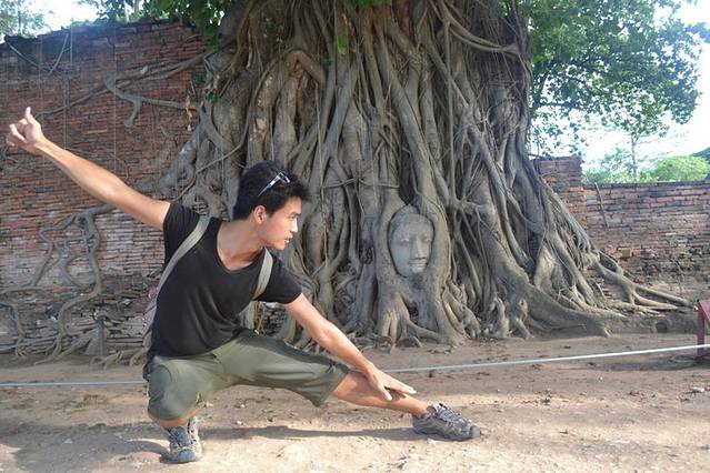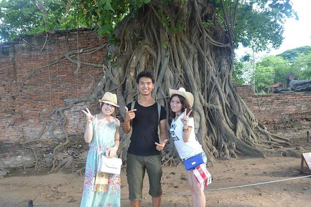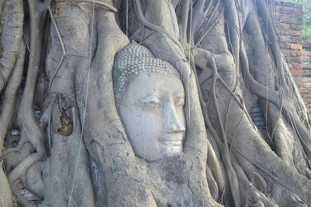 藏在树根下的佛头,据说这也是大城一个最精彩的景点,谁又能想象到,大自然的神奇用这种方式跟遗迹融合在一起
