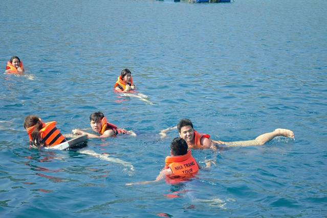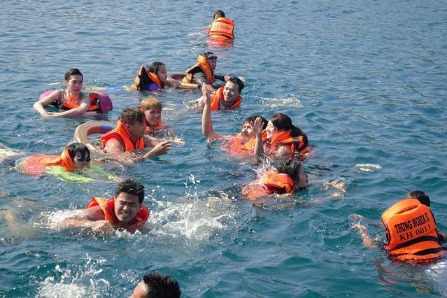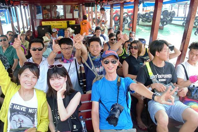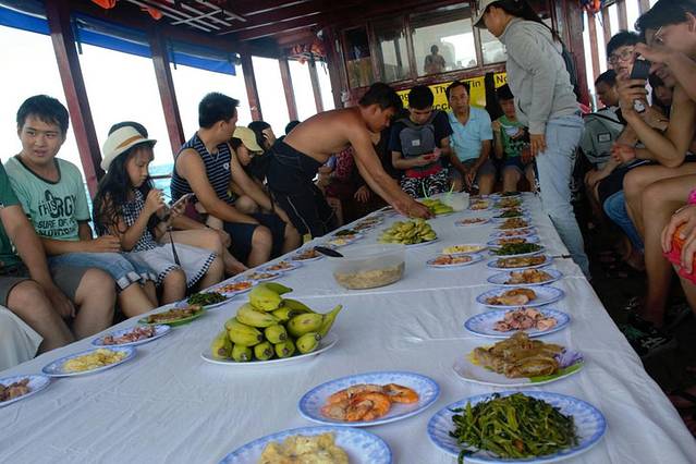 中午的团餐在船上进行,所以大家上船的时候一定要选好位置,否则可想而知,一定吃不饱。而且吃完饭还有节目表演,在中间也可以更好的看表演。最好玩的就是跳海喝茶游戏,在水深20米的海边,会有渔民捧着啤酒,想要喝到啤酒,就要自己跳下去,游过去,一马当先,勇者胜。我们称之为"勇敢者游戏"