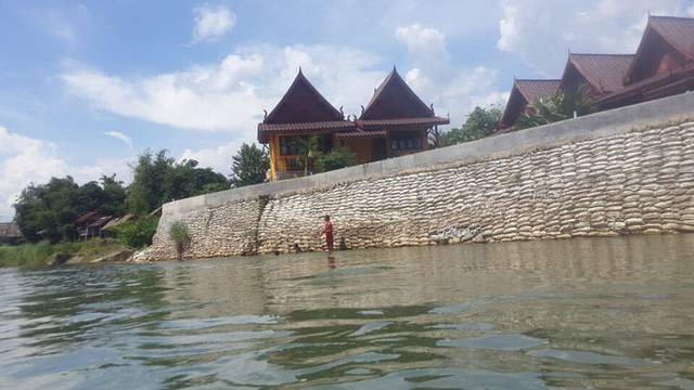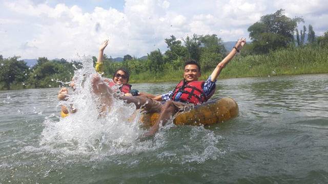 左顾右盼犹豫不定的时候,阿鹏不合时宜的撑着轮胎,喊着"蛇,你妹,是蛇~"我们放眼看去,一条长溜溜的动物,昂着头,吐着信子,分明是一条水蛇啊。妈呀,吓了一身汗,换个镜头看看土豆,双脚还在轮胎上晃悠的时候,刹那间,腾的一声,站起来,扑腾扑腾的往岸边跑,那样子生怕再出来一条,咬上一口,这前不着村后不着店的,就完了。这青山绿水固然美,但现在也没心思在看下去了,我们5人就这样在岸边坐着,这要到处走走,越走越远,走散了更麻烦,脑洞大开,想是不是一直飘,就飘到泰国了啊,还省的办签证了,但是想想让土豆跑上来的生物,还是给泰国边境一次赚钱的机会吧。
