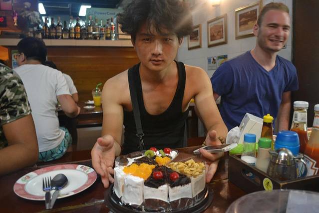 小十这孩子晚上过生日,找了好久,问了多人,附近根本没有蛋糕房。最后在一家大型超市糕点区买到个12寸左右的,这已经是最大的蛋糕了.其实蛋糕产业在这边是个盲区可以考虑…这次挑选的饭店相当不错,周边饭店门可罗雀而唯独一家车马兴隆,排队就排了一个小时,价钱合理且出国两个多月第一次吃出家的味道,依旧老规矩一个人一个菜,冬阴汤确实很地道。