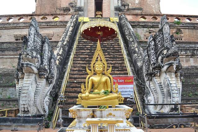 契迪龙寺因寺中央一座兰纳式四方形大佛塔而得名。与帕邢寺并列为清迈地位最崇高的寺庙。该寺由兰纳王国萨孟玛王兴建于公元1411年,用于供奉其父的骨灰,因此又称“隆圣骨寺”。如今,大佛塔的四个方向已摆上新的佛像,但柱廊和护塔的灵蛇均没有原来的精巧。南侧的墙上有6只大象雕塑,其中5个都是后来用水泥修复的仿制品,只有最右方的一个是保留下来的原作,由砖砌成再抹上灰泥。但由于多年风吹日晒,鼻子、耳朵均已损坏。其实,泰国的大多数寺庙都是金碧辉煌的,但是帕提隆寺确实简单的墙壁,反而给人返璞归真的感觉,更能让人体会到历史的沧桑感,佛的真实自然。