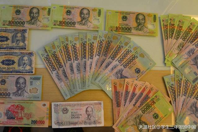 1刀(美元的简称)=6.2人民币左右;1元人民币=3500盾(vietnamese dong)左右;1美元=21700盾左右。越南这里美元和越南盾是通用的,不管是吃饭还是住酒店。由于每天的汇率都有波动,所以只能估个大概。建议换钱的小伙伴去银行,我们换了几千万越南盾,1:3400(出境口)、1:3450(店铺)、1:3500(银行),算起来银行较合适。我们中午吃饭花了30多万盾,您没有看错,一顿饭花几十上百万顿就是省钱达人了。瞬间我们也土豪一把。