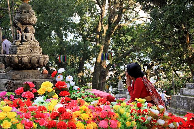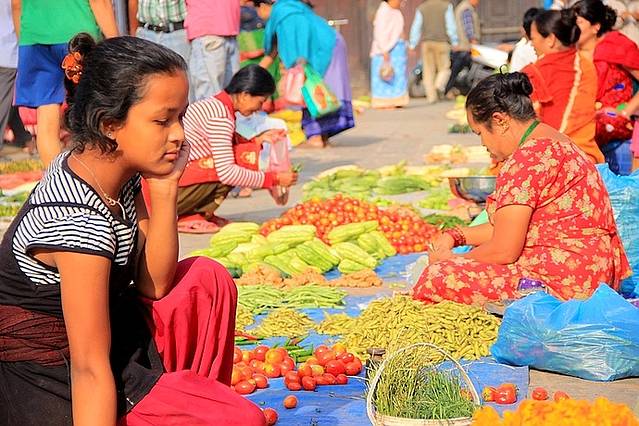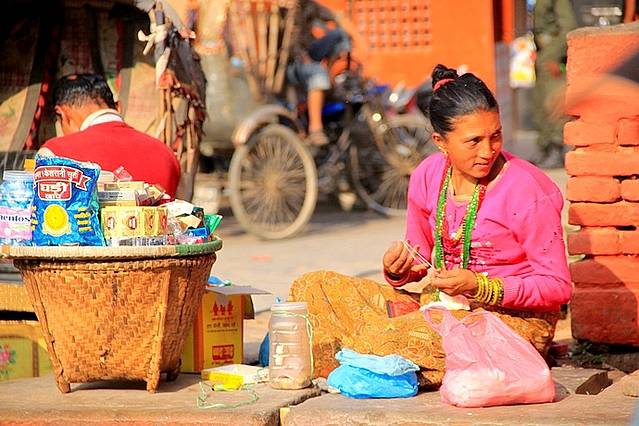 坐在台阶上卖花的尼泊尔妇女,因为生活所迫,即便是在一个男权主义国度,这样的画面也不少见。