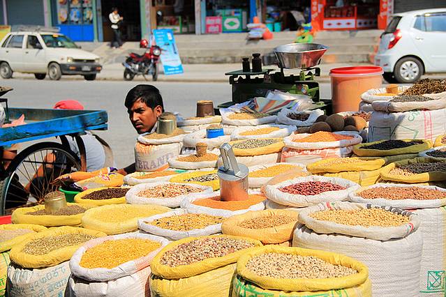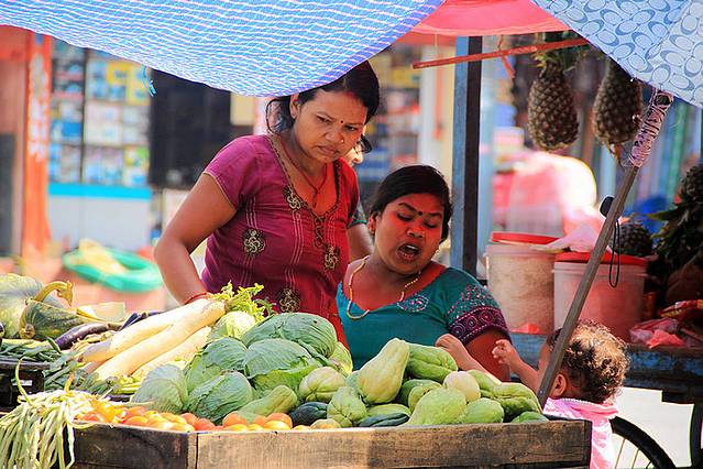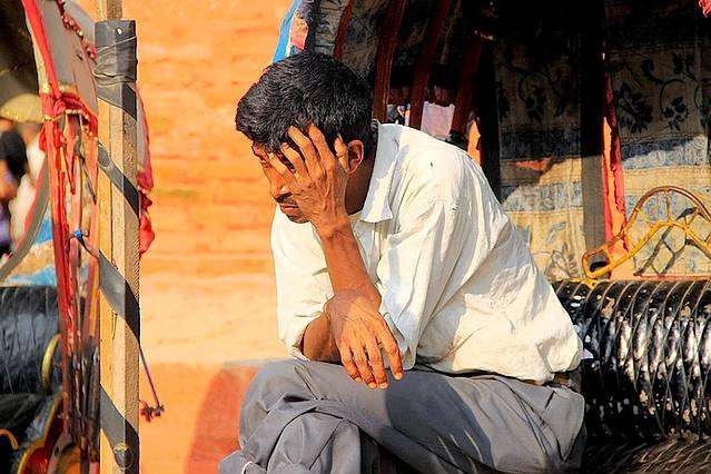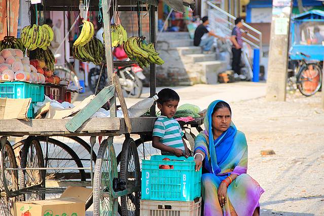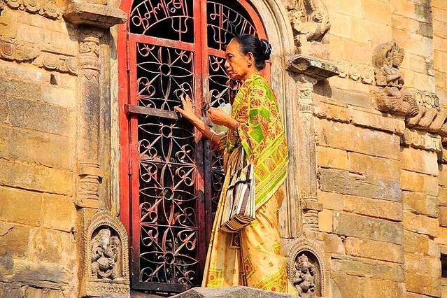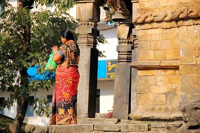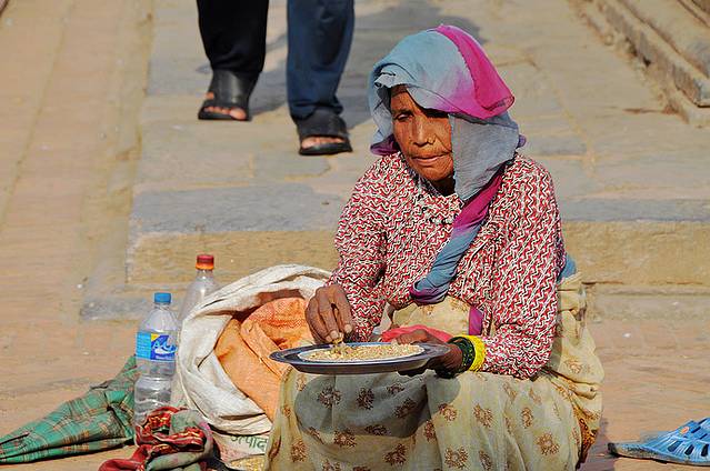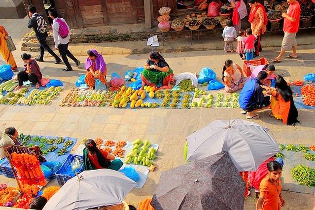 在神庙台阶摆摊的曝晒在烈日下的尼泊尔妇人,没有任何的遮阳防晒,似乎在生存面前,晒不晒并不是那么重要。