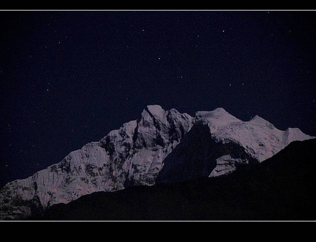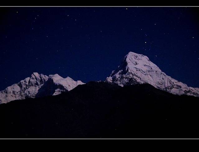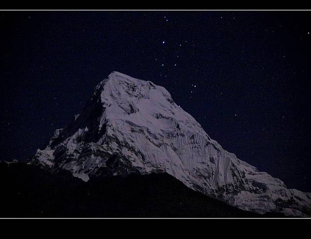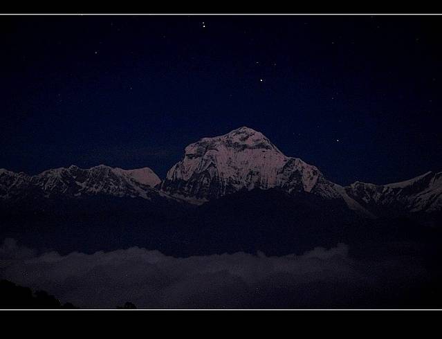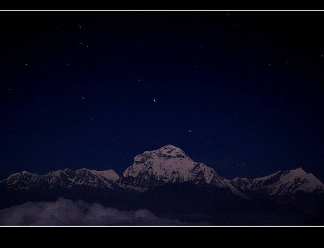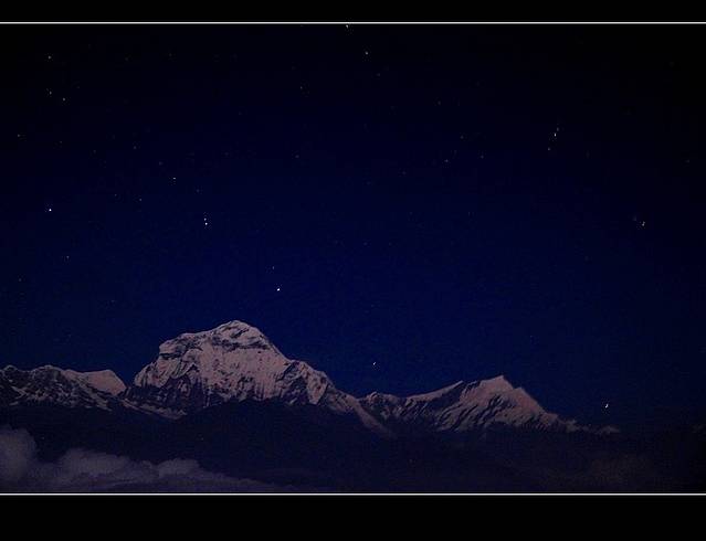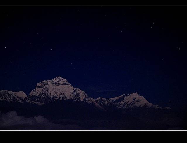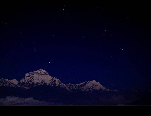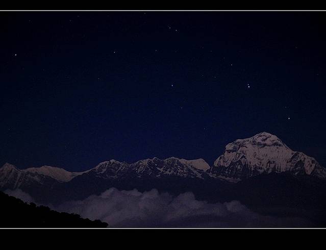 记得那晚,差不多九点,ABC徒步旅行的第二天晚上,在Ghorepani的一个叫SuperView的Lodge和老牛她们几个围靠在火炉边摆龙门,雷雷她们过来叫了几次出去说外面的星空很美,外面冷的要死,加上小时候在农村长大已经阅视过无数清晰透彻的星空,后来雷雷她们玩累了回房间休息,而我觉得闷想出去抽跟烟,结果,烟也顾不上抽了,皎洁的月色(农历八月十二),浩瀚的星空,亮白的雪山,连四周漂浮的云层都清晰可见,赶紧相机。