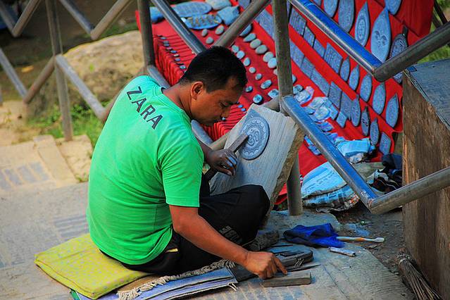 从山脚下沿着石梯拾级而上,坐在石阶上的尼泊尔民间手工艺人正在专心雕刻,丝毫没有收到镜头的影响,可能对于他们而来如此已经习以为常。