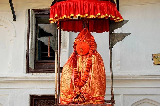 据说广场有座活女神庙,Kumari Bahal,具体位置未知,活女神库玛丽是圣洁的象征,传统的候选年龄是五岁,必须身体健康、美丽且为皇室处子,连星座和生辰八字也要与当今尼王一样才算合格。候选人会逐一被送往Talejn Temple过一夜;塔内放满骇人的骷髅头或是血淋淋的牛头和各种恐怖的面具,候选女孩若于翌日仍能面无惧色出塔,便为真命女神。活女神除保护王室外,并接受信徒的膜拜和满足观光客的好奇心。