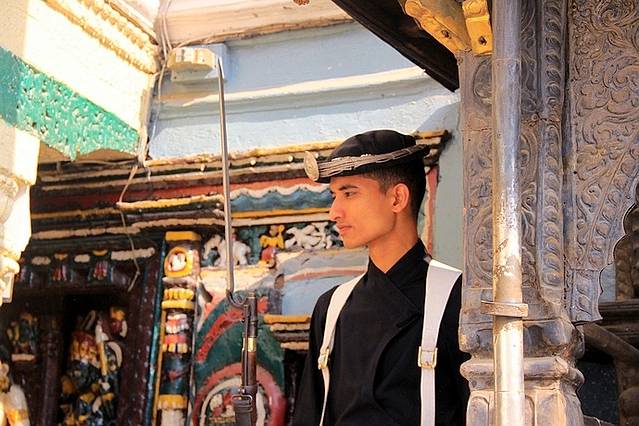 站立在王宫门口的帅气的尼泊尔皇家卫兵。