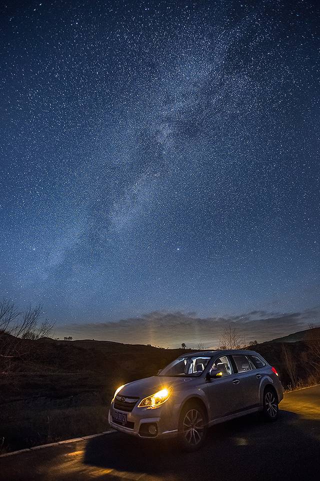 在八台子村拍完日落,我们便往老牛湾赶,沿着国道开了两个多小时,竟然一辆车都没有。看着车窗外那耀眼的星空,我们再次忍不住要拍照纪念。漫天的繁星犹如一幅美轮美奂的画卷,令人吃醉。听朋友说,好像斯巴鲁这个标志也是星星的意思吧,不知道拍没拍下斯巴鲁星呢?