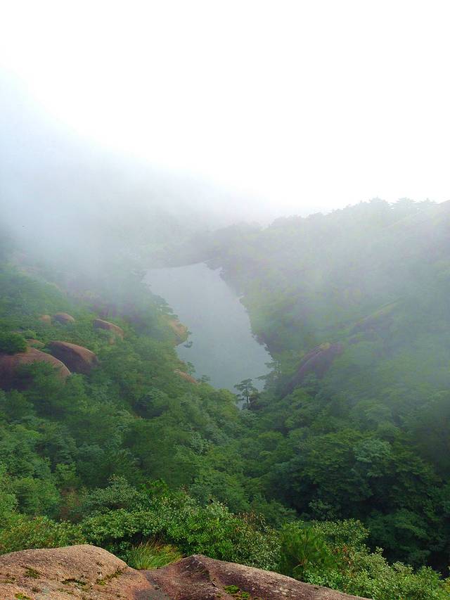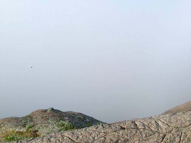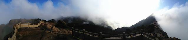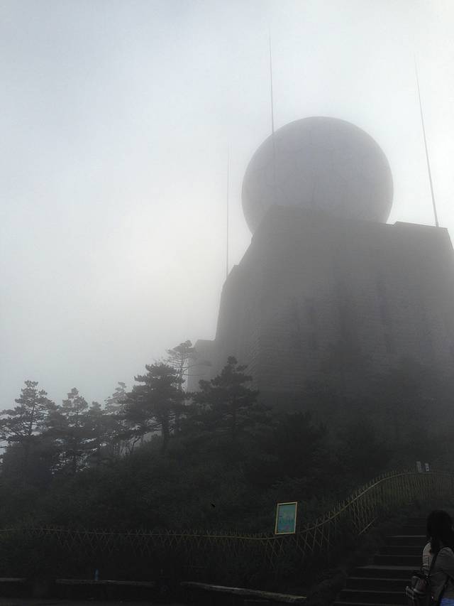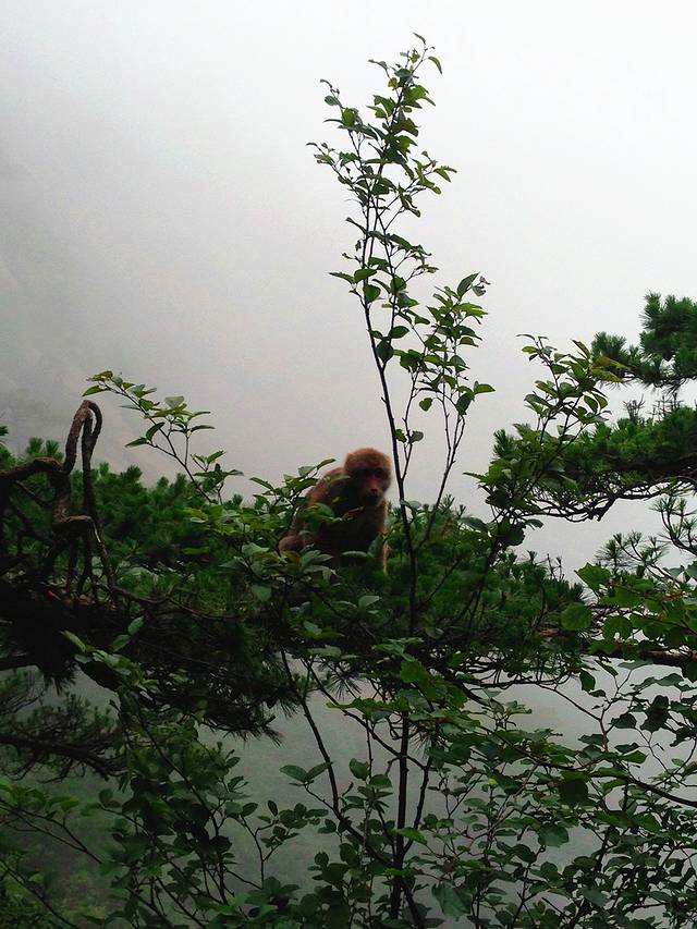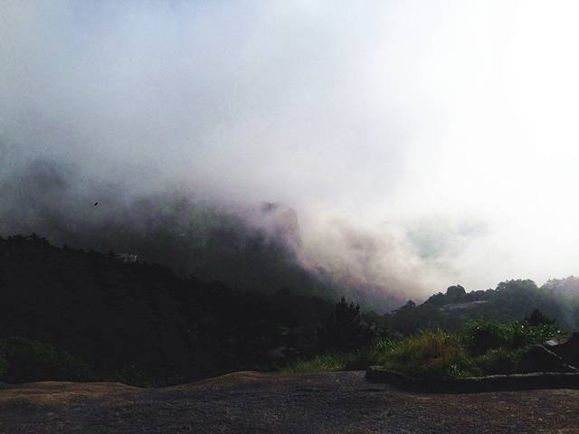 由于睡眠不足、体力透支,我的两个小伙伴“阵亡”了,在酒店睡觉后直接坐云谷索道下山!于是我只好单枪匹马按原计划下山,谁叫我精力充沛呢!从酒店大约步行半个多小时才能到达光明顶,可是早晨雾气太大了,看不清什么景致,不一会儿整个山头就被雾气占领了。