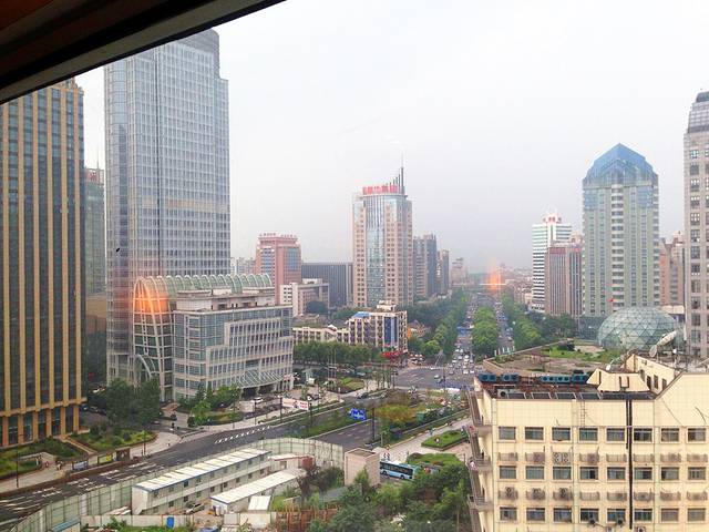 房间采光很好,亮堂,整个空间布局温馨,看起来很舒服。由于有些年头,家具都有些掉漆,看起来有点陈旧,不过卫生做的干净整洁,房间也没有异味,浴袍、保险柜、MINIBAR等设施设备齐全,绝对符合四星级标准。临窗还有沙发椅和小茶桌,赠送的祁门红茶味道很不错。落地窗的设计视野相当不错,周围是杭州的高楼大厦,夜景美美哒!