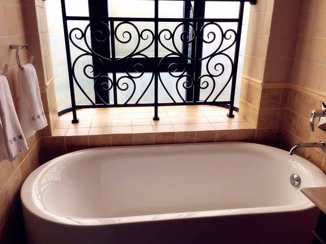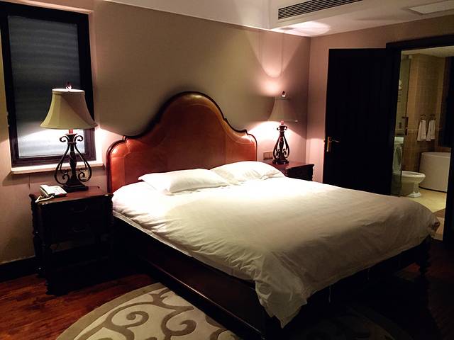 客房主卧装修依旧采用美式风格,无不透出奢华之风。两米的美式大床,床垫柔软度适中,睡起来挺舒适的,床品也较柔软。床头皮质靠垫显得高档了不少。床两边摆放着设计典雅的床头柜,两盏精美的台灯衬托出浓浓的艺术气息。但是设计的十分不人性化的是,床头两边的插座设在墙的下方而且是给台灯使用的。还有右边床头柜上方的小窗户没有窗帘遮挡,天亮后阳光射进来十分影响睡眠。