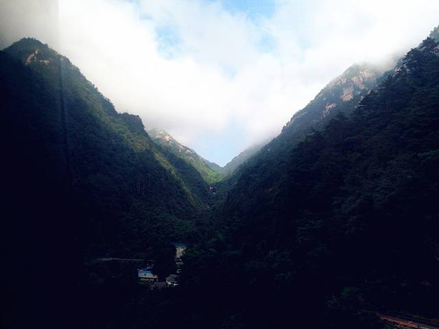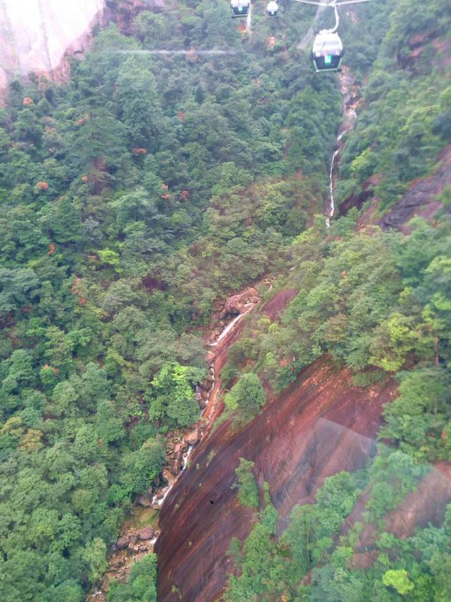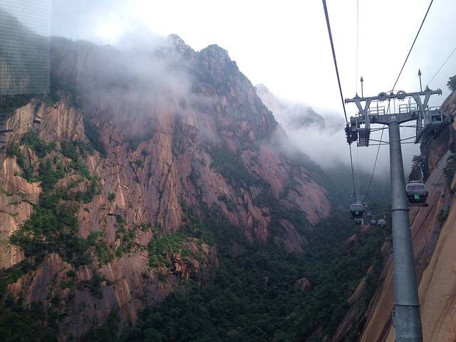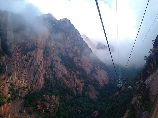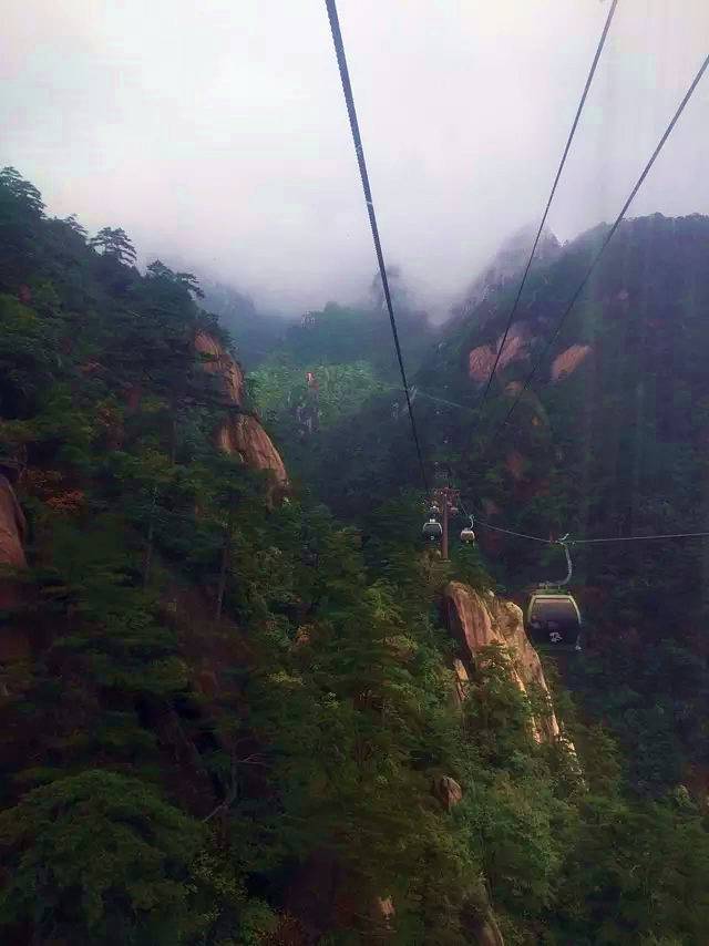 缆车玻璃被雾气笼罩着,看不大清楚窗外的黄山,但是随着缆车高度的上升,雨似乎渐渐变小了,窗外雄伟秀丽的黄山还是深深的震撼着我们的心灵,雨中的黄山美令人窒息!隐隐约约的瀑布、奇松、怪石都被我们踩在了脚下!不过心想如果是晴空万里应该也是另一番摄人心魄的美吧! 缆车全程大概15分钟左右抵达了山上的白鹅岭站。