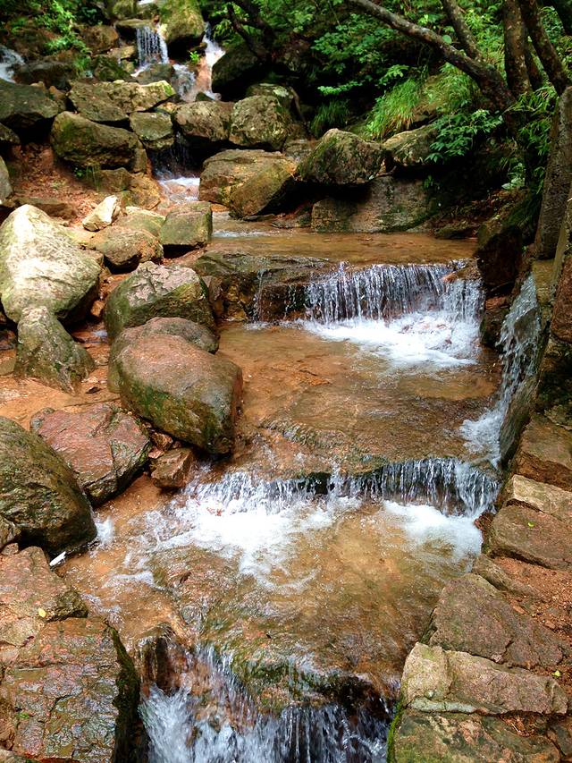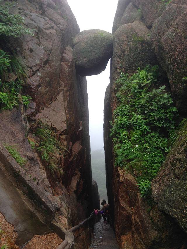 过小心坡、渡仙桥,有一道两壁夹成的狭长石梯,最窄处仅半米,此处一线天虽然不是我见过最窄的一线天,但是却是最陡的一线天,陡峭程度让我胆寒。而且石壁上有一处水源,水流顺着台阶流下去,伴着流水声,攀着扶手小心翼翼的走下去,本以为有水会滑,其实粗糙的石面一点都不用担心滑倒。