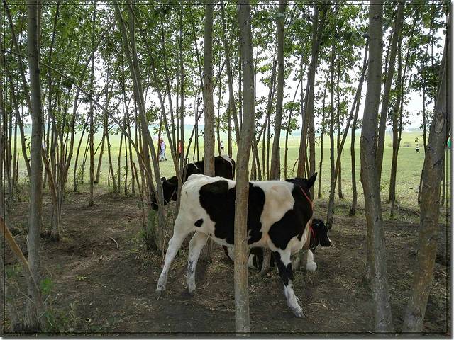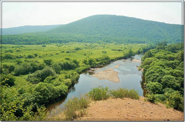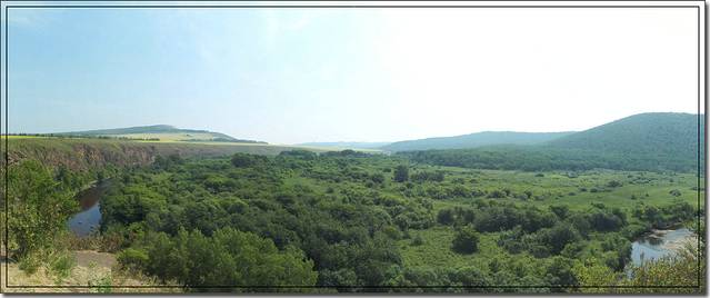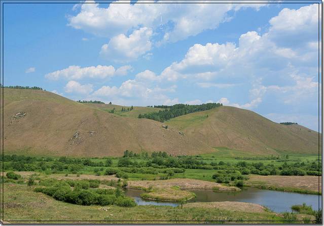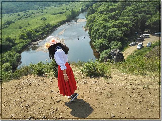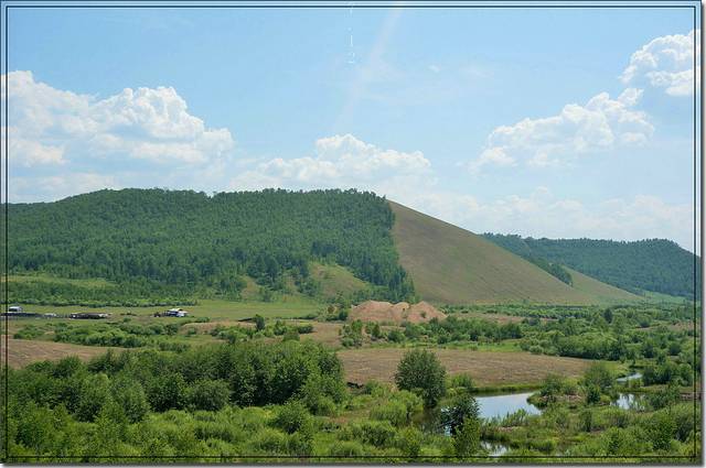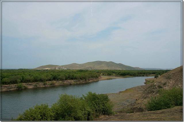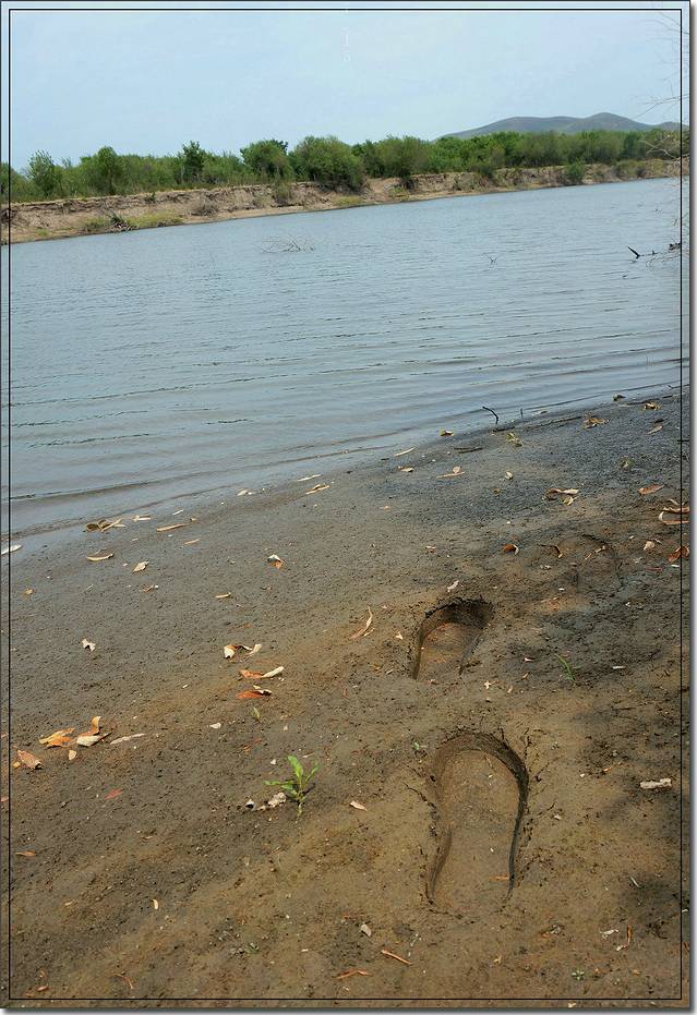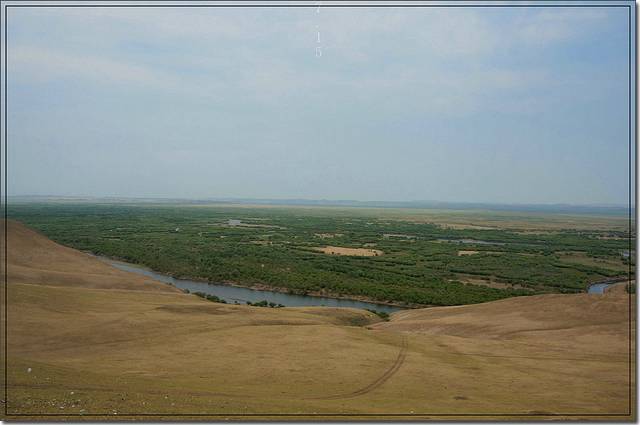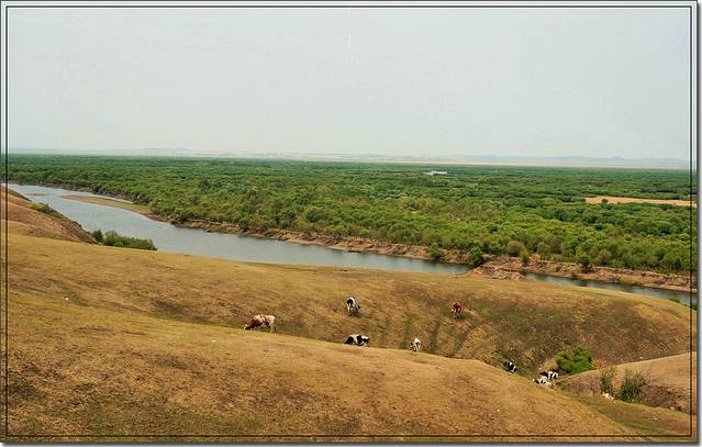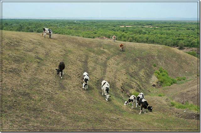 从马场出来,大家都意犹未尽,由于时间还早,我们又去根河湿地。据说根河湿地是亚洲第一大湿地,不过我们也没有进景区,就在一个山坡头,看了对面的湿地,因为有河流,有水源,所以绿意盎然,而我们脚下的山坡,却是光秃秃的。沿着斜坡往下走,路过一群正在吃草的牛,话说这草真的很稀少又黄,也不知道牛们能吃饱么。再往下走,就到了河边,今年大旱,水位不高,在河边的泥土上踩了些脚印,也不知道自己心里在想着什么。
