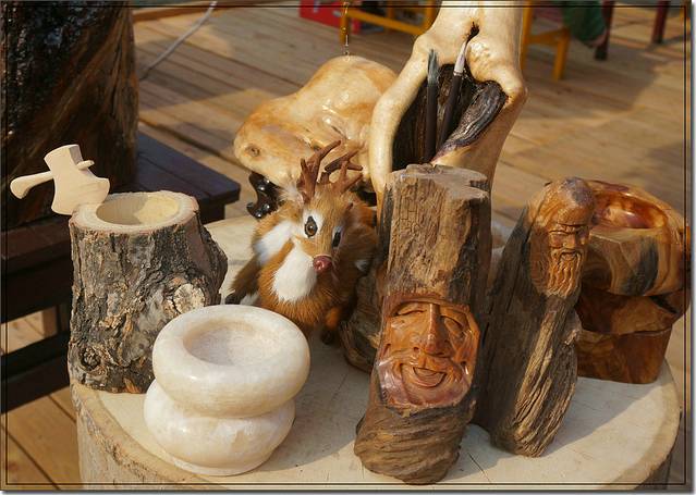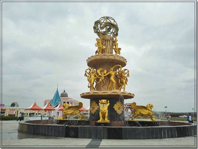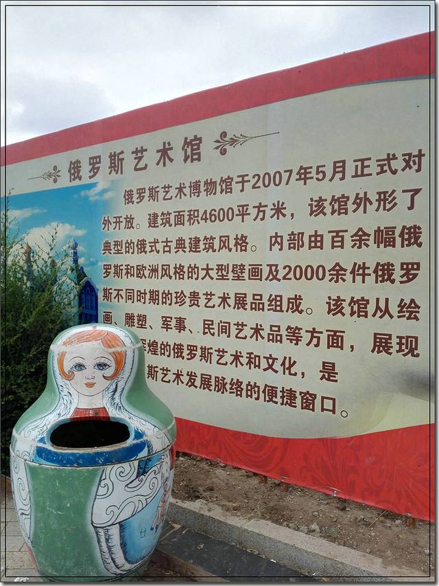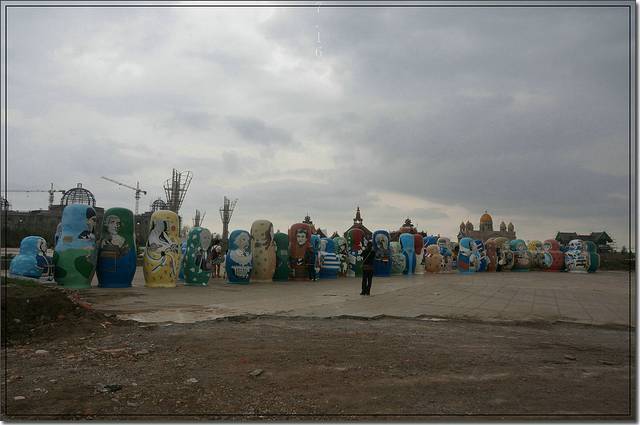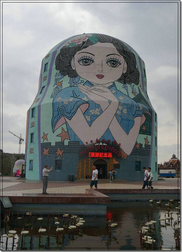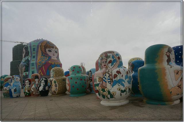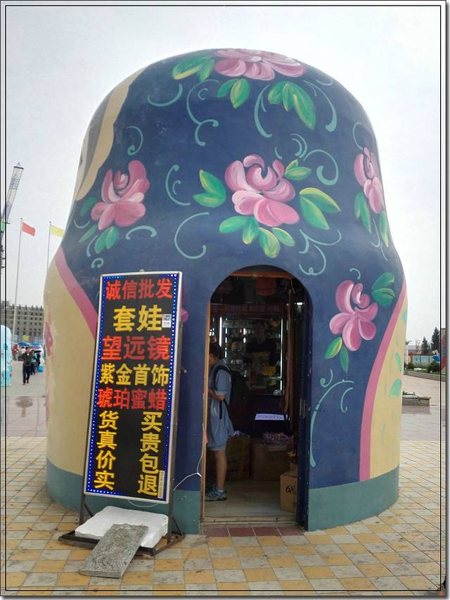 天一直阴沉沉的,到套娃广场的时候下起了雨滴,下车去广场上看传说中创造了吉尼斯世界纪录的套娃,说实话,周边在修建什么,到处都感觉乱糟糟的,据说以后这里全修好可能会收费,除了广场上大大小小的套娃之外,其他真心没啥好看的,至于套娃,据说这里面有个一往情深矢志不渝的爱情传说,一俄罗斯靠谱男青年思念自己的爱人,所以雕刻了大大小小爱人的木雕,没想到后来实在太多,屋子里放不下,最后只好一个一个套起来,于是就成了现在的套娃,之后传到满洲里,也正因为这个故事,所以套娃上刻的全是女生,一般都是5个,从出生,长大,到结婚生子,最后儿孙满堂,刻画了一个女人幸福的一生,不过,现在各种工艺品店里卖的套娃,稍微好点的价格也不菲,我就没有去凑热闹了。