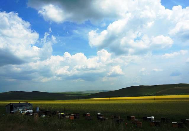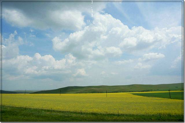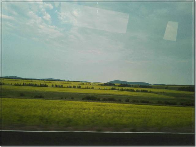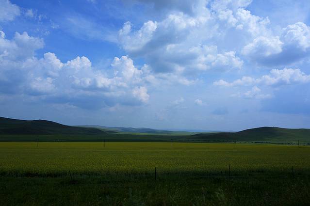 见多识广的司机说呼伦贝尔的油菜和麦子地都是隔年分开的,今年这块地种麦子,明年就会种油菜,很多草地都保护了起来,只可惜今年大旱,草长势不是特别好,再加上天气不是很好,经常灰蒙蒙的,没有风吹草低见牛羊之壮观呀。