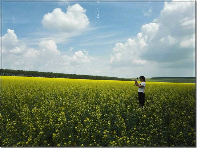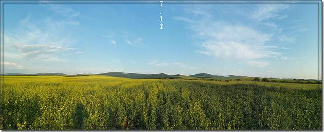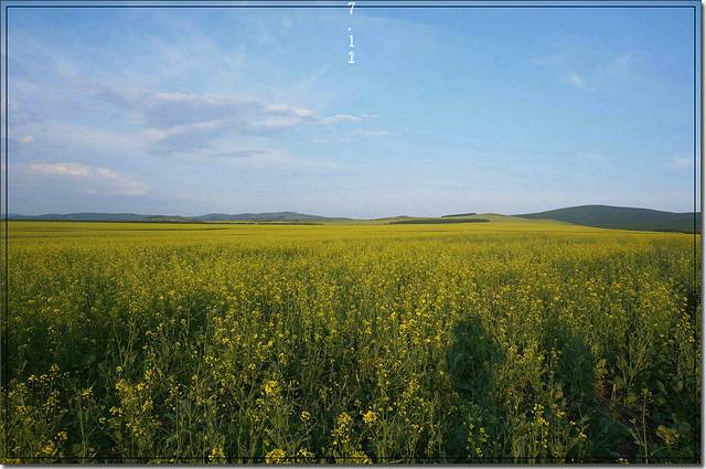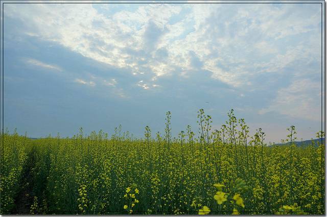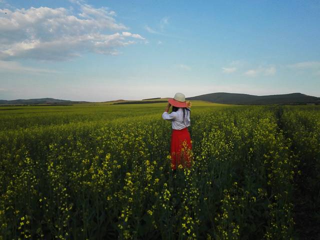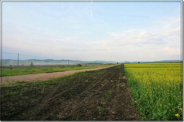 待雨小了些,我们继续向黑山头出发,今天的路程比较远,绕一圈又回到了额尔古纳,途中还经过了我们第一天吃烤全羊的地方,颠颠颇颇转了好久,途中又遇到一大片油菜花田,这里的油菜比前些天看到的高些,之前那些都只有半个人高不到,但是这里的有一个人那么高,终于有点像南方的油菜了。