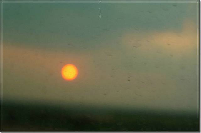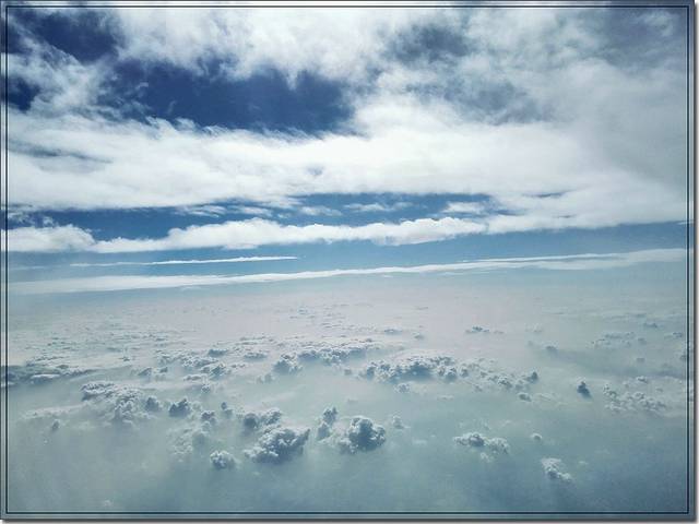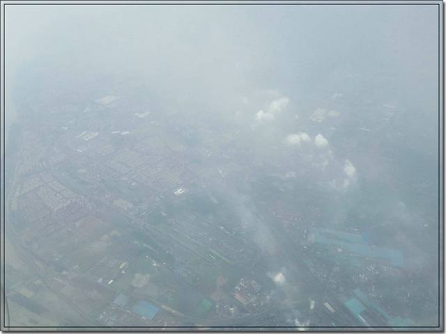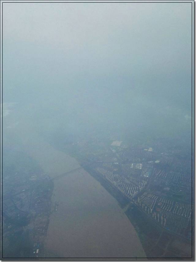三点半,总算起飞啦,一上天空没多久就只看见雾蒙蒙的一片,下雨那都是横着下的,飞一会之后虽然还是雾霾,但依稀能见到下面的南京,还有浑浊的长江。