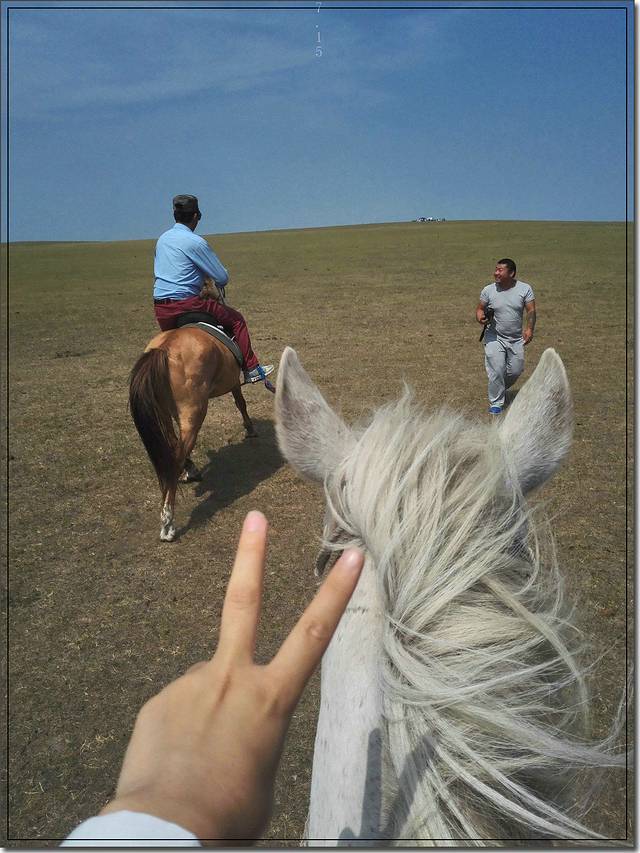 马队一直慢慢在走,也不知道怎么的,慢慢的我的胆子就大起来,还敢策马小跑了,再后来还敢掏出手机拍照片,绝对的惊喜,今天天气不热,风很大,在草原上策马奔腾,感觉真的很好,不过要是能和心爱的人一起策马奔腾,共享人世繁华,那更是人生一大幸事。不过初次骑马,不仅腰疼,屁股更遭罪啊,在马背上的时候就觉得疼,回去后才发现屁股上磨破了皮,还出血啊,坑爹的……