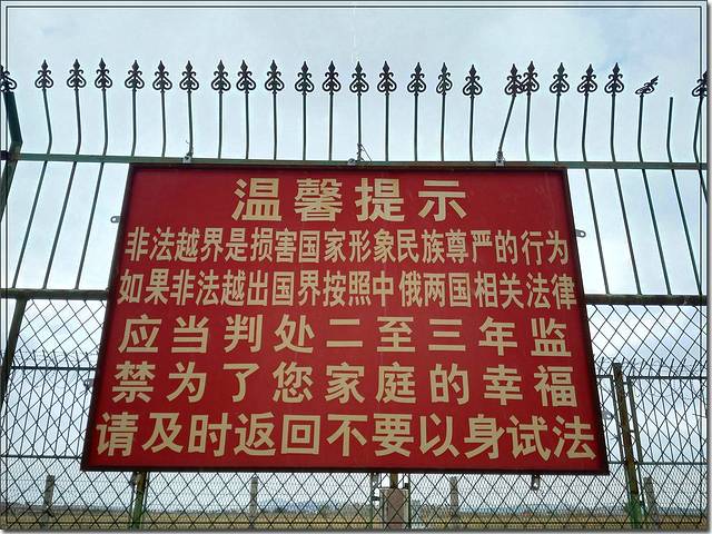早饭后去国门,我们去的是后门,其实就是一个牌坊,景区里没进去,门票80,司机说里面没啥,就有一个火车道,我们选择不进景区。在后门那里透过铁丝网可以看到界碑,不过我这高度近视眼又没戴眼镜肯定看不清是啥,铁丝网上有一块红底黄字的告示,说是非法越界损害国家形象,会判2-3年监禁,为了您家庭的幸福,请及时返回不要越界。再往远处看还有一个白色的牌坊,据说那也是国门,可以登上去。