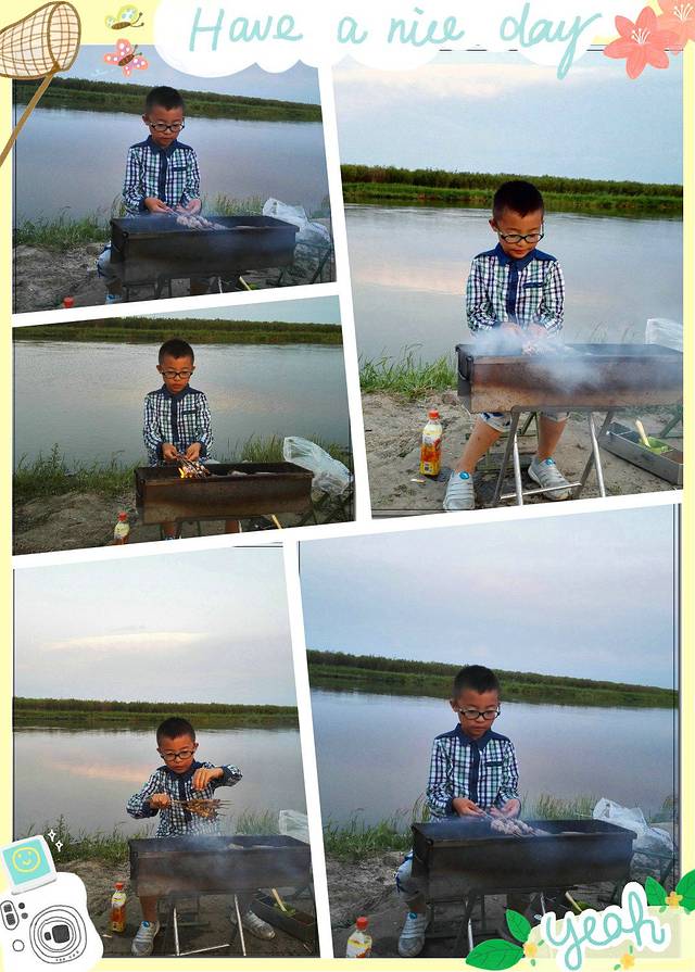 吃完饭后太阳也要下山了,虽然今天没有什么蓝天白云,但是日落还是赏心悦目,虽然海拉尔河的水不是很清澈,但河边草色青绿,河水弯曲,风光不错。我搬了个凳子坐在河边玩手机看风景,后来店家的儿子和孩子们混熟了,给他们烤羊肉串,还真挺像那么回事。看不出来他已经十一岁了,看上去比那群孩子们还小,果然,在城市里生活的孩子还是长得好很多。