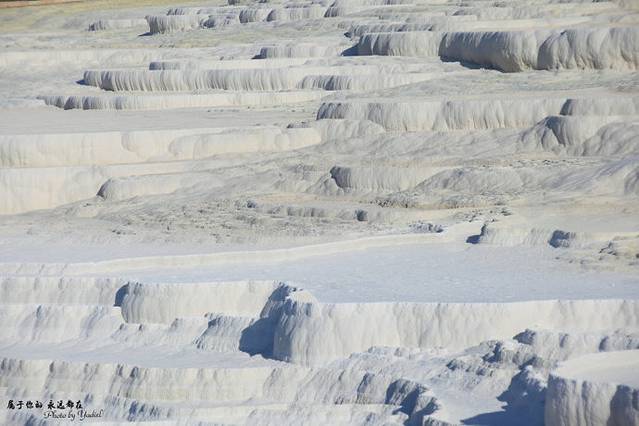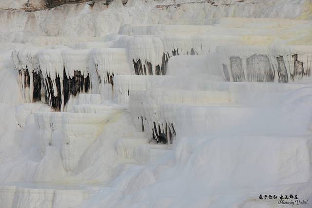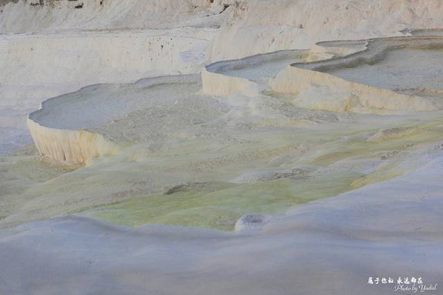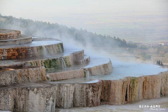 此地多温泉,温泉自洞顶流下,将山坡冲刷成阶梯状,平台处泉水蓄而成塘,人们可坐在里面泡温泉,既解乏,又健康;泉水中的矿物质沉淀下来,把整个山坡染成白色,像露天溶岩。