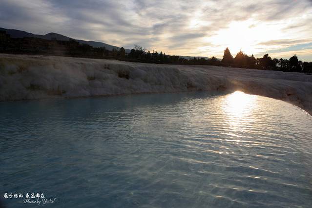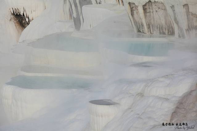 棉花堡位于土耳其西南部,如此可爱的名字,源自其外形像铺满棉花的城堡。那是堆积棉絮一般的一座“城堡”,玉一样的半圆形白色天然阶梯层层叠叠,犹如雪砌的梯田,远看像大朵大朵的棉花矗立在山丘上,无数涓涓细流从丘岩间的缝隙潺潺流下,温热的水蒸气让棉花堡氤氲在淡淡的缥缈雾气里,泉水积在台阶之间,形成一汪汪波澜不兴的水池。