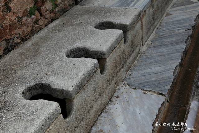 能不能猜到这个是做什么的?这是世界上最早的冲水厕所!别看着其貌不扬的厕所,石板下面是石头砌成的沟渠,2-3米深,有流动的水经常冲刷。在当时可是只有贵族男人才能进入的地方,而且这是上层社会的一个社交场所。通常,由奴隶先坐上去,将石板坐热了,主人才坐上去方便。方便的同时,还可以将双脚放到前面的温泉水沟里,然后和邻座聊天、交友。如此惬意,所以很多贵族上厕所都要半天,这里便也成了积累人脉、扩大社交圈的地方。