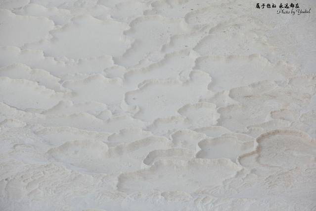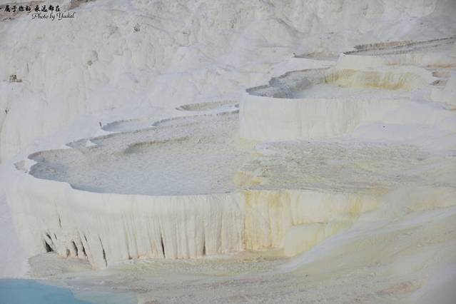 所谓“棉花”,就是泉水从山顶往下流,所经之处历经千百年钙化沉淀,形成层层相叠的半圆形白色天然石灰岩阶梯,远看像大朵大朵棉花矗立在山丘上,更像染白了的大梯田,所以土耳其人叫它“棉花堡”。
