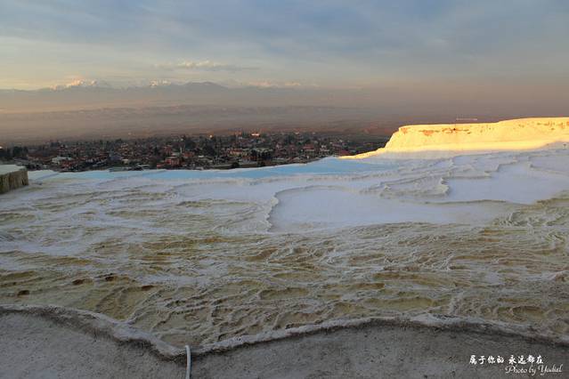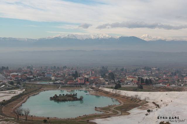 整个棉花堡温泉由山坡构成,一层又一层,形状像城堡,故得名棉花堡。耸起的棉花堡山坡,与远处的皑皑雪山、朵朵白云遥相呼应,还守护着山脚下城镇。