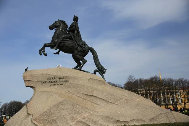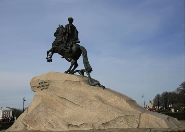 彼得大帝青铜骑士雕塑>按照叶卡捷琳娜大帝的吩咐制作的。铜像被安置在一块重达160吨的天然巨石上,头戴桂冠的彼得大帝稳骑在前蹄腾起的骏马上。