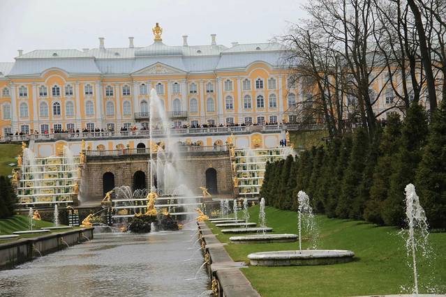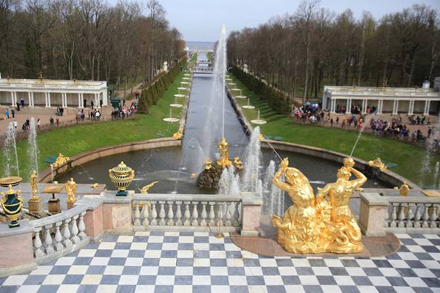 夏宫最具动感的景观,最妙的是在当时没有水泵的帮助下,仅借助波罗的海”地势压力,使这水柱喷上20米的高空!由140座喷泉组成喷泉群,部分是彼得大帝亲自设计的。水渠尽头就是——“波罗的海”