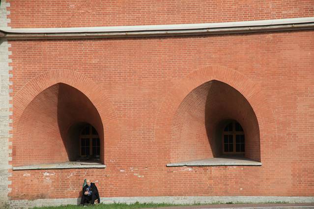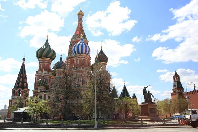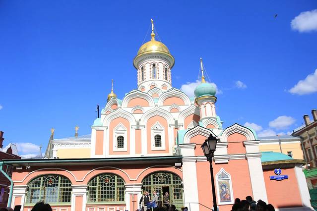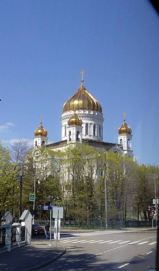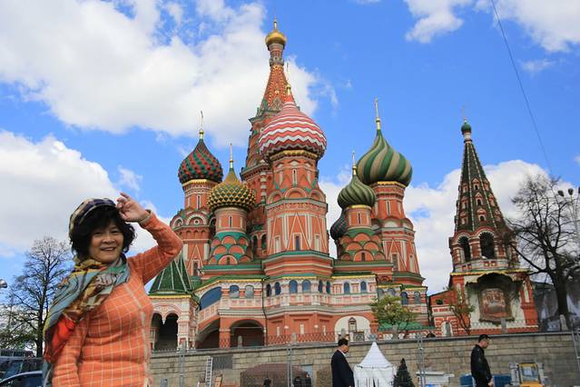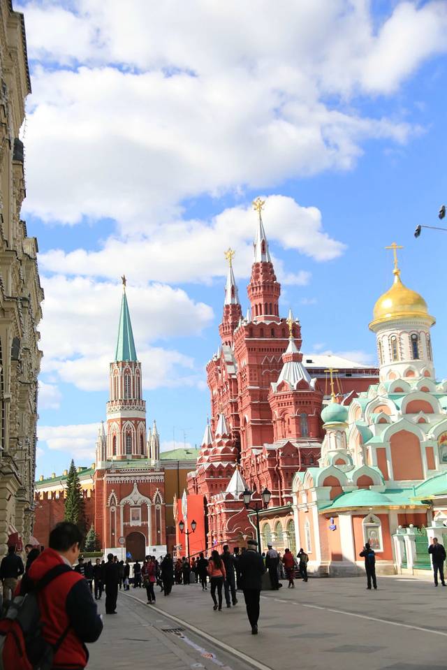 这边能看红白波浪型的“洋葱”啊!教堂高高的穹顶都是镀金的。教堂紧傍着红墙,红墙那边就“克林姆林宫”。 俄导说:当年伊凡大帝在庆祝酒会上问设计师:你们还能建出比这个美的建筑吗?喝得醉眼的二位设计师齐说:可以!!伊凡大帝为了让世界上不再出现比这更美的教堂,竟然残酷地弄瞎了二位设计师的眼睛。
