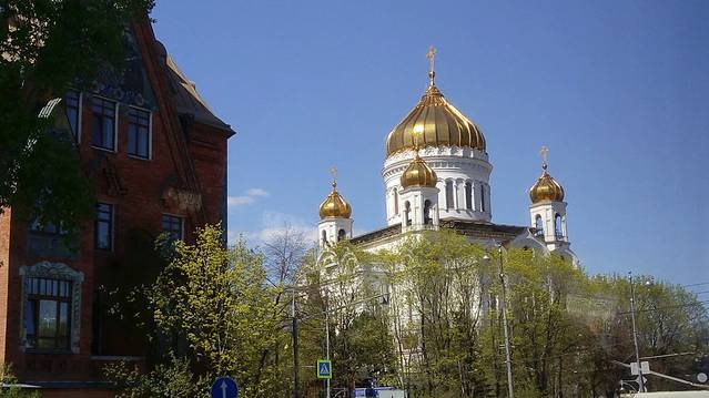 《救世主大教堂》——位于莫斯科河畔,为纪念1812年抗法战争而建,1831——1887年开始启用,是莫斯科最大的教堂,有5个镀金的葱头状圆顶。